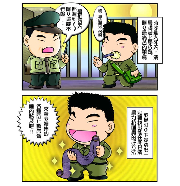 阿Q跟大家一樣想到早上要從暖暖的被窩裡爬起來,就又想要窩回去...