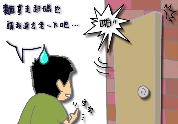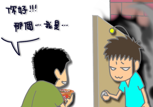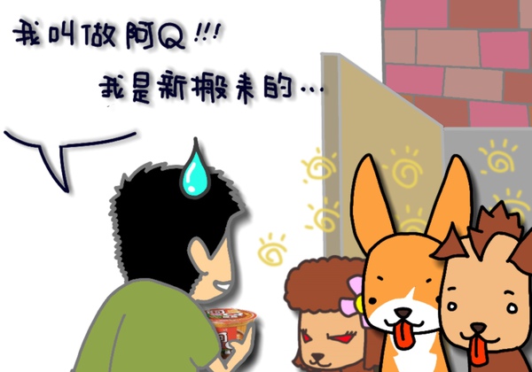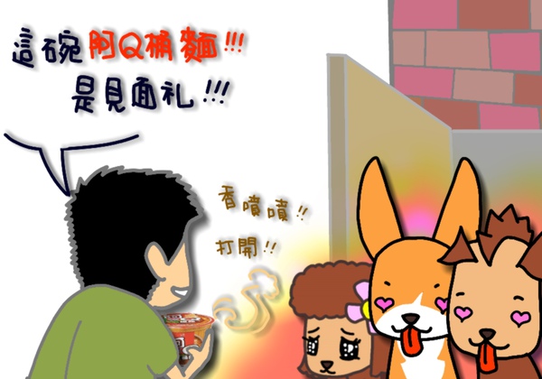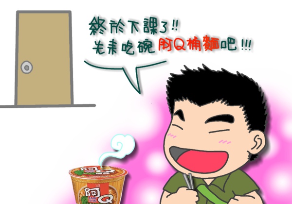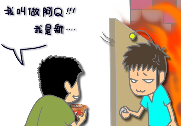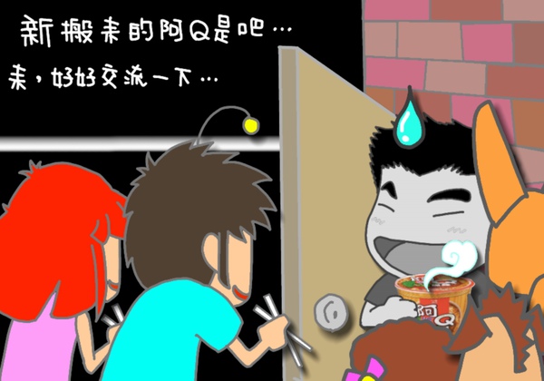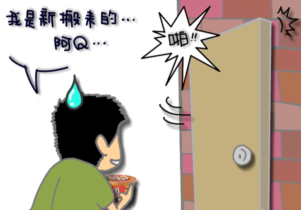 於是新搬來的鄰居阿Q,就心不甘情不願的捧著那碗香噴噴的阿Q桶麵去應門...